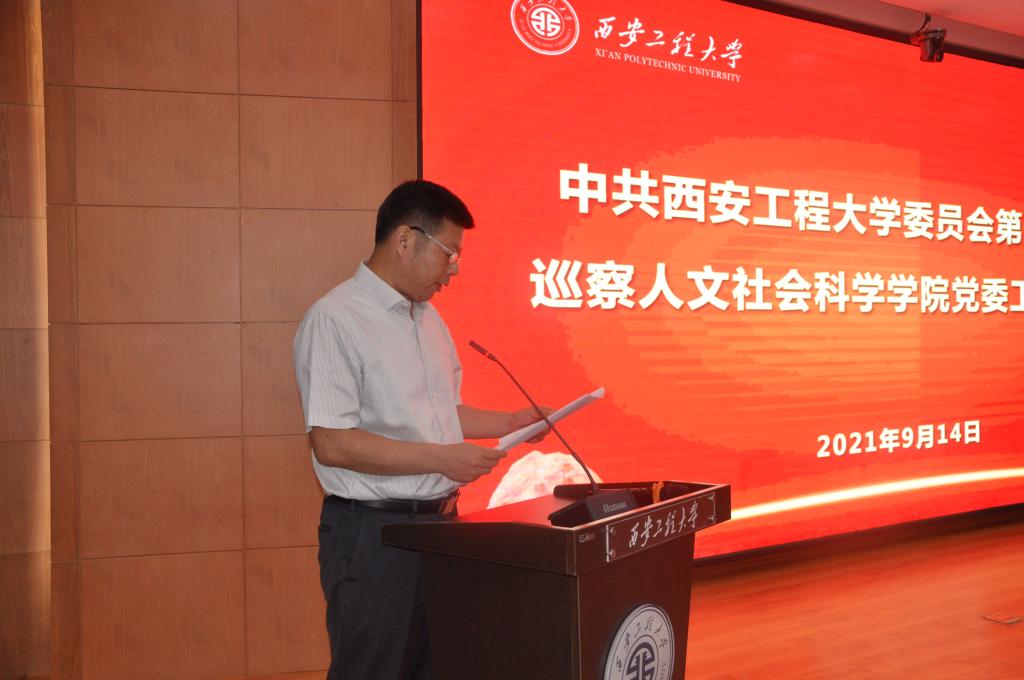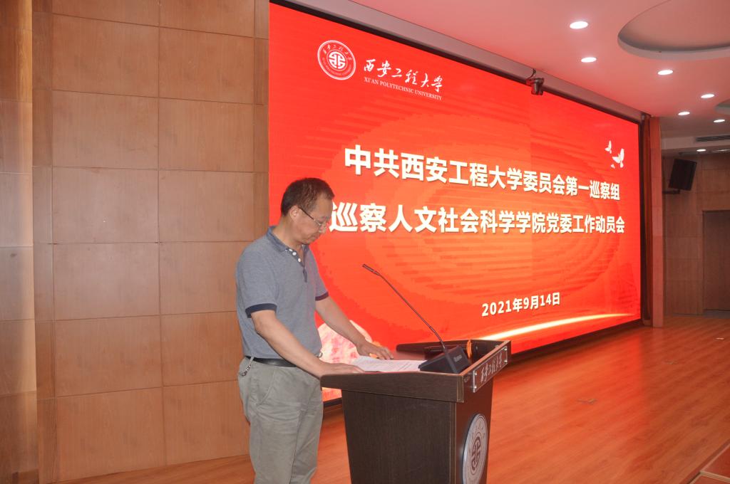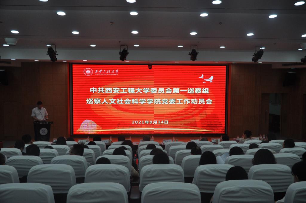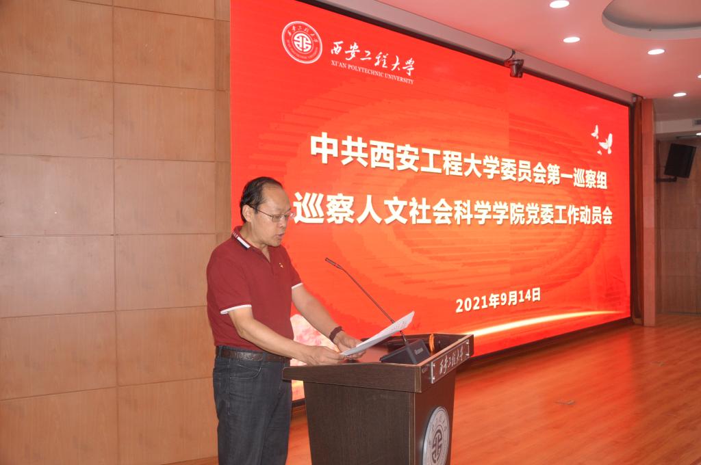 根据学校党委统一部署,2021年9月14日下午,党委第一巡察组巡察人文社会科学学院党委工作动员会在临潼校区图书馆一楼报告厅召开。校党委委员、副校长朱永民出席会议并讲话,党委组织部长孙晓宁宣读《中共西安工程大学委员会关于第二轮巡查组人员授权任职及任务分工的决定》,第一巡查组组长高建会做动员讲话,人文社会科学学院党委书记徐利兰作表态发言。中共西安工程大学委员会第一巡察组副组长王鸣媛、郭可义及巡察组全体成员、人文学院党委委员、班子成员、教授委员会委员、分工会委员、副高职称及以上人员、科级以上干部、党支部书记、系(中心)负责人、学科带头人、党代会和教代会代表、民主党派代表、教师代表、学生代表等参加会议。会议由人文社会科学学院院长胡伟华主持。